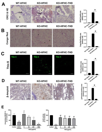 3.3. Attenuation of HFHC-Induced Lipid Deposition and amyloid-beta (Aβ) Plaque Formation in the Brains of ApoE-/- Mice