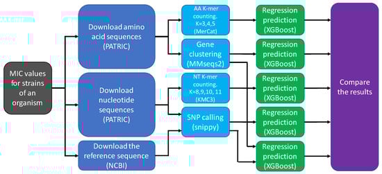 AMR can be measured as a continuous variable or as a discrete variable. Certain methods [,,,,,,,] classify the genomes into two classes of resistant or susceptible with respect to a certain antibiotic. For example, in the case of [], mapping was to three classes: resistant, intermediate and susceptible for Acinetobacter baumannii, Staphylococcus aureus, Streptococcus pneumoniae and Mycobacterium tuberculosis. In cases of [,], the intermediate class was merged with the resistant class (for AMR predicting of Escherichia coli, in [] and for AMR prediction of Staphylococcus aureus, Pseudomonas aeruginosa and Escherichia coli, in []). On the other hand, methods such as [,,,,,] use machine learning to predict the minimum inhibitory concentration (MIC) of an antibiotic on a certain strain. These papers predicted MICs of different antibiotics for Streptococcus pneumoniae [], Neisseria gonorrhoeae [], Klebsiella pneumoniae [] and Salmonella [], and the MIC of ciprofloxacin for Escherichia coli []. MIC is defined as the minimum concentration of an antibiotic that will inhibit the visible growth of a microorganism after overnight incubation []. One shortcoming of methods that predict resistance or susceptibility is that the definition of a resistant or susceptible strain depends on clinical breakpoints (thresholds) [,]; however, in some cases, there is no agreement on the values of these breakpoints between scientific institutions []. Moreover, the breakpoints are subject to change over time [], resulting in different definitions of resistance or susceptibility to an antibiotic. On the other hand, MIC prediction does not rely in on a breakpoint. MIC also provides some resolution as to the reflection of level of resistance, rather than a binary output of resistant or susceptible. As a practical example, this can help distinguishing between a strain that has a very low MIC and a strain that is susceptible but has an MIC that is close to the breakpoint []. From the machine learning point of view, in these methods quantitative MIC prediction is a regression problem, meaning that a continues value is outputted by the machine learning algorithm, which is the MIC, unlike classification problems where a discrete label such as 0 for susceptible or 1 for resistant was outputted.
