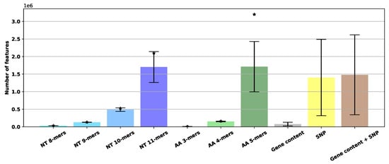 When comparing different feature extraction methods, it is important to take the number of features into account, because it directly affects memory usage and computational complexity. For k-mer counting methods, the number of features is determined by the number of existing k-mers in all genomes. For SNPs, the number of features is the number of existing SNPs in all genomes multiplied by four, because of one-hot coding of four possible nucleotides after mutation. In case of gene content, the number of features is the number of existing clusters after clustering the genomes. Finally, for “gene content + SNP” the number of features is simply the addition of the number for gene content and SNP methods. Figure 3 depicts the average and standard deviation of number of features for each method across all species. For SNP data, although the number of features is large, the data are always sparse (more than 95% zero) so sparse data format can be used to mitigate memory issues.