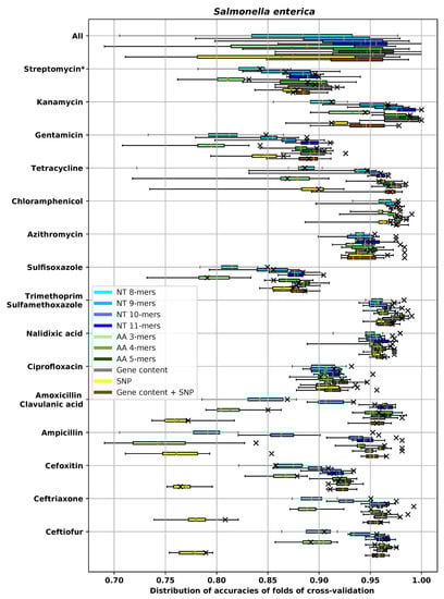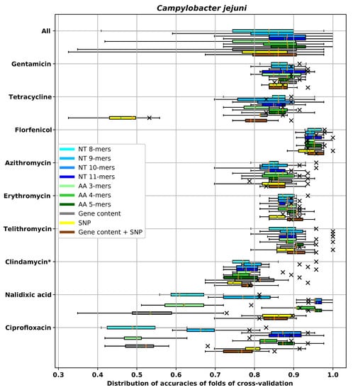 Distribution of ±1 two-fold dilution accuracies in different methods for Campylobacter jejuni. The box plots are similar to Figure 4. The orange line represents the median and the green line represents the mean. The × marks represent the accuracy of the hold-out set. The antibiotic used for hyper-parameter tuning is indicated by an asterisk. For each method, the top boxes, labeled as “All,” were obtained by combining all ten folds for all antibiotics.