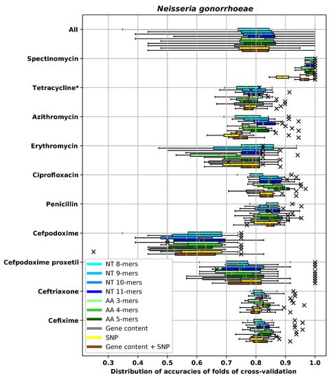 Different papers have used different feature extraction methods to present genome sequence data as input to prediction models such as support vector machines [,,], neural networks [], or gradient boosting [,,], for AMR prediction. In [,], for example, the authors used, as features, single nucleotide polymorphisms (SNPs) in genes that previously were known to have drug-resistance mutation for Mycobacterium tuberculosis. In another paper [], the authors also used SNPs to predict resistance in Mycobacterium tuberculosis, in two scenarios: only using SNPs in known AMR genes and using all SNPs in the dataset. In [], SNPs from whole-genome sequence (WGS) to predict resistance for Neisseria gonorrhoeae. In [], the following feature extraction method was used for binary AMR prediction in Escherichia coli: The authors first clustered all genes in all genomes using 95% amino acid identity. Genes that existed in all genomes were labeled as “core” genes, and genes that existed in some genomes were labeled as “accessory” genes. Then, a genetic algorithm (GA) method was used to choose which subset of accessory genes should be used for AMR prediction. Finally absence or presence of chosen accessory genes in each genome was used as feature to predict AMR. Khaledi et al. [] tried gene expression, gene absence/presence, SNP calling and different combinations of those features for binary AMR prediction in Pseudomonas aeruginosa. For gene absence/presence, they clustered all of the genes with the condition of 95% sequence alignment coverage (genes went to the same cluster only if there was 95% coverage when they aligned using BLAST). Then absence or presence of each gene cluster in each genome was used as a feature. Hyun et al. [], used absence/presence, but since gene clustering ignores genetic variation, they also included unique amino acid sequence variants or “alleles” of each gene. In their definition a core gene was a gene that was missing in at most 10 genomes. Similarly, in [] both SNPs and gene absence/presence were used to predict AMR for Elizabethkingia. Reference [] used different features, including absence/presence of accessory genomes, SNPs, indels and year of isolation for Escherichia coli.