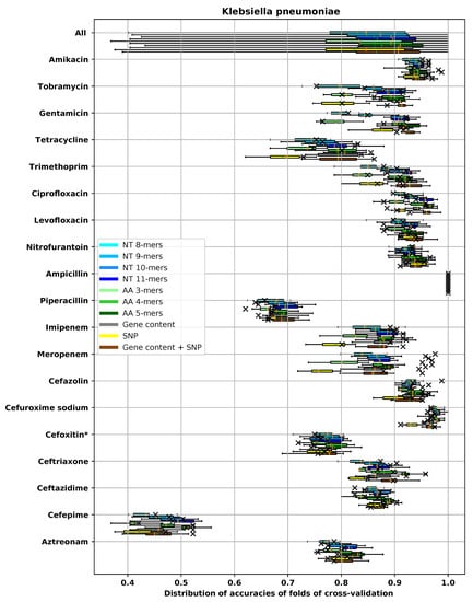 For the dataset for each species and antibiotic combination, we tested and compared different feature extraction methods. In the main text, we used ±1 two-fold dilution to measure MIC prediction accuracy. A complete evaluation of all models using all metrics described in Section 2.4 is provided in Appendix E. Since we used cross-validation to measure the performance, in each experiment there were 10 different prediction accuracies corresponding to 10 different folds. The average and the box plot of distribution of the ±1 two-fold dilution accuracies are reported in Figure 5, Figure 6, Figure 7 and Figure 8 for different species. In these figures, the antibiotics are ordered based on their classes. In each box plot, the whiskers represents the maximum and minimum. The boxes represent the first and the third quartiles. The orange line represents the median and the green line represents the mean. The accuracy on the hold-out set is also represented by an “×” mark.