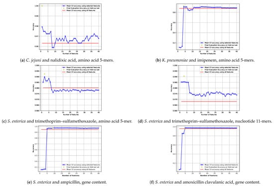 In Algorithm 1, is a hyper-parameter. We tested the values of [20, 30, 40, 50, 60, 70, 80] for this hyper parameter on a dataset of C. jejuni and tetracycline using gene content feature extraction. To find the best value for this hyper-parameter, we needed a metric to evaluate different values. Since the purpose of this pipeline was to find important features, the best performance was achieved by the set of features that resulted in good accuracy with the fewest features. The good accuracy that we choose as the benchmark was the average cross-validation accuracy when all of the features are used. In other words, the question was using which value of can a pipeline that is only using the selected features reach the average cross-validation accuracy of a pipeline that is using all features. The best performance was achieved by = 50, where the pipeline reached an accuracy better than the average accuracy of model trained with all features using only 10 features.