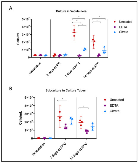 Of the three anticoagulants that have been used for Borrelia recovery, heparin was eliminated from our experimental design at the outset due to previously documented contraindications. It is a known inhibitor of molecular analyses, particularly PCR, and is also a well-characterized ligand of Borrelia [49,50], which could further confound observations. Perhaps as a consequence, heparin has fallen out of use in Lyme disease investigations since the late 1990s (see Table A1). There are precedents in the literature to suggest that all anticoagulants used for recovery of whole blood may impact growth to a certain degree, but the relative inhibition of growth at the microbiological level has not yet been assessed [48]. In this experiment, B. burgdorferi strain B31 cultured in liquid BSK medium was seeded directly in the EDTA, citrate, and uncoated vacutainers, and either grown in that environment or subcultured in fresh broth and counted weekly using a Petroff-Hausser chamber.
