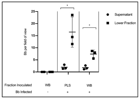 Stratification of Borrelia in blood following separation of cells and plasma. Quantification of Borrelia per field of view in the supernatant/liquid fraction and cellular/lower fraction following centrifugation at 400× g, 20 min. Data presented as the means with standard deviation. Asterisks (* = p < 0.05) indicate significance difference using one-tailed paired t-tests (n = 3).