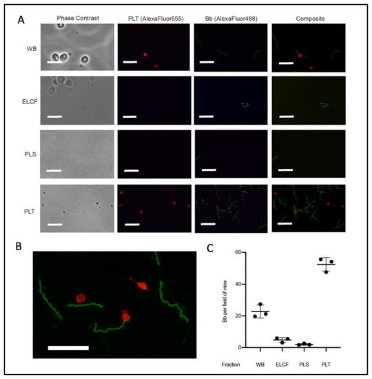 Although the outcomes of our studies are clear under the conditions tested, Borrelia are diverse and complex bacteria, and their associations with the host are incompletely characterized. Parameters that could be varied to further contextualize these findings include the origin and derivation of Borrelia strains used (lab-adapted vs. clinically isolated), centrifugation speeds, infection time, platelet count, and bacterial MOI in blood. The highest MOI used in this study was 1 Bb:20 erythrocytes for experimental infection of whole blood, which is significantly lower than other host–cell interaction studies. However, this inoculation strategy resulted in a ratio of 2.3 Bb:1 Plt in whole blood and in the platelet fraction after centrifugation. Studies investigating host-pathogen associations typically have more Borrelia present than host cells, spanning MOIs of 5 spirochetes:1 host cell on the low end of the spectrum, up to 5000 Borrelia/host cell [64]. Increasing the pathogen burden and/or incubation length in the infection model could result in a number of physical and physiological changes that alter how Borrelia partition in the blood, potentially enhancing the phenomenon we describe here. Ultimately, evaluating the Borrelia content of platelets obtained from naturally infected LD patients would provide the most relevant insight into the clinical applicability of this blood fraction.