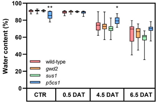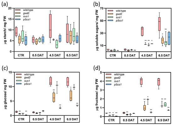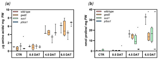 Among the proteinogenic amino acids, accumulation of proline is a well-documented response to several adverse conditions [27,45,46]. For this reason, proline accumulation can be assumed as an indication of proper response to stress. All genotypes, except p5cs1, accumulated proline in response to 150 mM mannitol treatment (Figure 5b). However, at 6.5 DAT, the increase was much less pronounced in gwd2 and sus1 lines, which accumulated only 44% and 52% of wild-type proline content, respectively (Figure 5b).