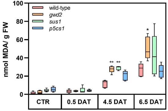 Drought promotes the formation of reactive oxygen species (ROS) that interact directly with different macromolecules causing oxidative stress. In particular, the increase in ROS levels leads to lipid membranes oxidation with the subsequent formation of lipid hydroperoxides and their toxic aldehyde degradation products. The levels of lipid peroxidation, expressed as malondialdehyde (MDA) content, were measured in mannitol-treated plants. As shown in Figure 2, no difference was observed among the various genotypes under control conditions and at the onset of the osmotic stress (0.5 DAT). However, as the stress proceeded, the behavior of wild-type plants and T-DNA lines started to differ. At 4.5 DAT, the concentrations of MDA in gwd2 and sus1 plants were about double compared to wild-type plants. At 6.5 DAT, the difference was maintained only in gwd2 plants, while the sus1 line did not show significantly different levels with respect to wild-type plants (Table S2).