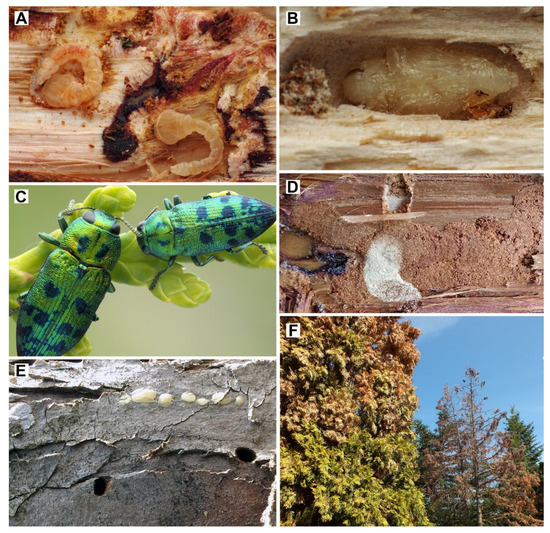 Lamprodila festiva. (A) Larvae under the bark of Platycladus occidentalis; (B) pupa; (C) adult specimens; (D) larval tunnels under the bark; (E) exit holes on branches; (F) trees damaged by L. festiva in Hungary.
