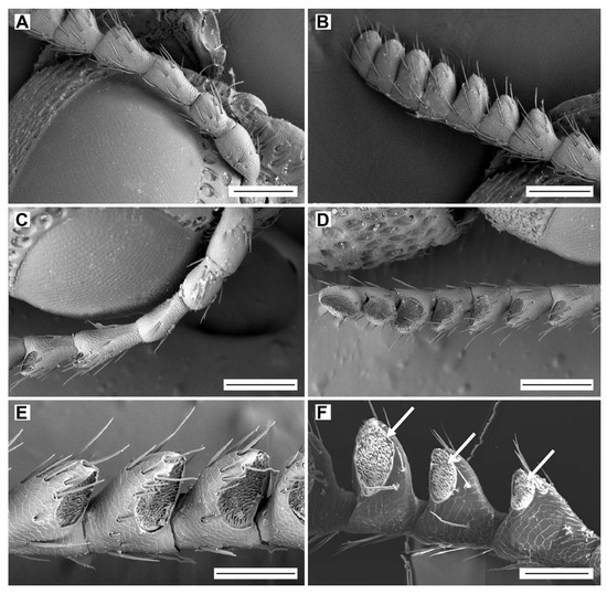 General morphology of antennae of Lamprodila festiva. Female, left antenna: (A) antennomeres I–VI, dorsal view; (B) antennomeres IV–XI, dorsal view; (C) antennomeres I–V, ventral view; (D) antennomeres V–XI, ventral view; (E) antennomeres VI–IX, details of apical depressions, ventral view. Male, right antenna: (F) antennomeres IV–VI, details of apical depressions (arrows), ventral view. Scale bars = (A–D): 200 µm; (E,F): 100 µm.