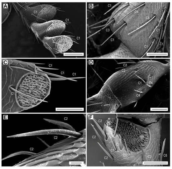 Aporous sensilla chaetica C1 and C2. (A) Antennomeres IX–XI with sensilla C1, ventrolateral view; (B) antennomere IV with sensilla C1, C3 and C5, dorsal view; (C) antennomere XI with sensilla C1, ventral view; (D) antennomere I with sensilla C1, C2 and C4, dorsal view; (E) sensilla C2 on antennomere I; (F) sensilla C1, C2, C3 and C6 on antennomere VII, ventral view. Scale bars = (A): 100 µm; (B–D,F): 50 µm; (E): 10 µm.