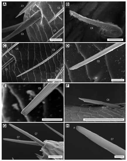 Sensilla chaetica C5 are present only in females. Two of them are on the dorsal face of each of the antennomeres IV–XI, located in the middle of the distal part of antennomere (Figure 3B). They are subparallel to each other but because they are slightly curved, they face each other by their concave parts (Figure 3B and Figure 4C). The wall includes 10 longitudinal furrows, which are deeper than those in the previous subtypes of sensilla chaetica. They are among the longest and slenderest sesilla chaetica (Table 2), and can be easily recognized by their subparallel sides, with basal and distal diameters of approximately 2.9 and 2.5 µm, respectively. Additionally, they have a special apex, which is more or less obliquely truncated (Figure 4D), most probably with a terminal pore (Figure 4E).