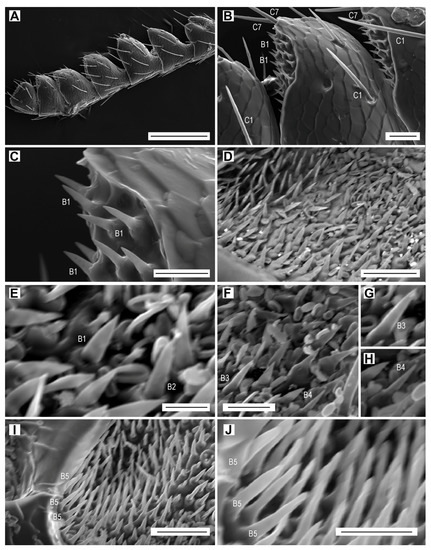 Sensilla basiconica. (A) Male antenna, dorsal face; (B) antennomere X with sensilla basiconica B1 in the apical depression, and sensilla chaetica C1 and C7; (C) sensilla basiconica B1; (D) apical depression on antennomere X, showing the field of sensilla basiconica; (E) sensilla basiconica B1 and B2; (F) sensilla basiconica B3 and B4; (G) sensillum basiconicum B3; (H) sensillum basiconicum B4; (I) sensilla basiconica B5; (J) close-up of sensilla basiconica B5. Scale bars = (A): 200 µm; (B,D,I): 20 µm; (C,F,J): 10 µm; (E): 5 µm; (G,H): not to scale.