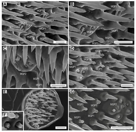 Multiporous grooved pegs MGP1 and MGP2 (complex). (A) Sensilla MGP1 and a complex of four sensilla MGP2 on female antennomere VI; (B) close-up of sensilla MGP1 and MGP2; (C) Sensilla MGP1 and a complex of six sensilla MGP2 on female antennomere VIII; (D) sensilla MGP1 and a complex of three sensilla MGP2 on female antennomere V; (E) position of sensilla MGP1 and a complex of three sensilla MGP2 within the apical depression of female antennomere IV; (F) close-up of sensillum MGP1 and a complex of three sensilla MGP2; (G) sensilla MGP1 and a complex of eight sensilla MGP2 on female antennomere XI. Scale bars = (A–D): 5 µm; (E,G): 10 µm; (F): not to scale.