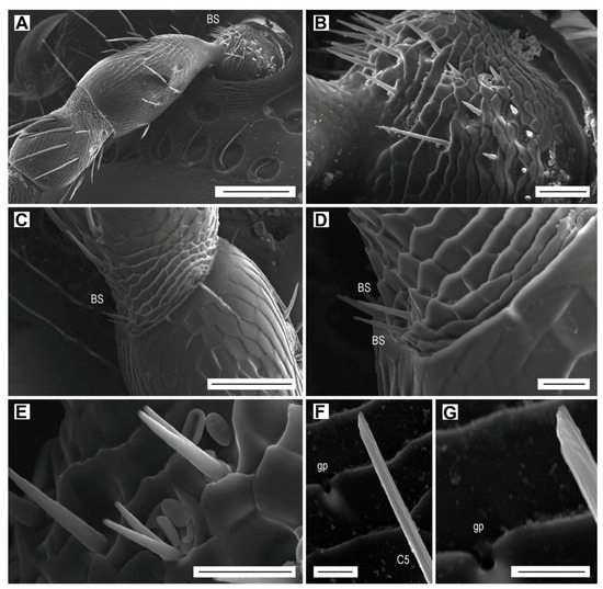 Böhm sensilla (BS) and glandular pore (gp). Böhm sensilla: (A) Scape and pedicel of the left female antenna, dorsal face; (B) Böhm sensilla on the scape; (C) Böhm sensilla at the base of pedicel; (D) close-up of Böhm sensilla; (E) bifurcated Böhm sensilla on the scape. Glandular pore: (F) glandular pore near sensillum C5 on antennomere IV; (G) close-up of glandular pore. Scale bars = (A): 100 µm; (B): 20 µm; (C): 50 µm; (D,E): 10 µm; (F,G): 5 µm.