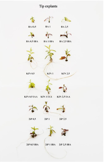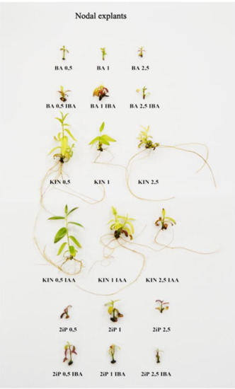 - Grendysz, J.; Wróbel, J.; Kulpa, D. Influence of micropropagation with addition of kinetin on development of a willow (Salix viminalis L.). World Sci. News 2017, 70, 201–215. [Google Scholar]