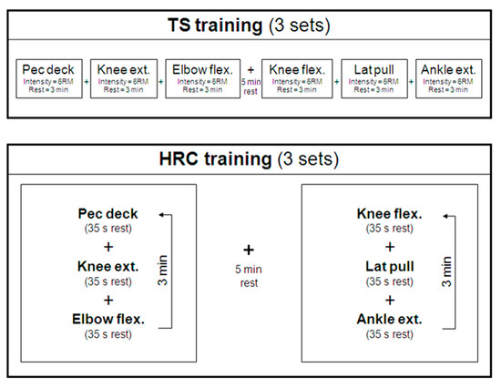 Experimental design. HRC = high-intensity resistance circuit-based training; TS = traditional strength training; ext. = extension; flex. = flexion. See text for more details.