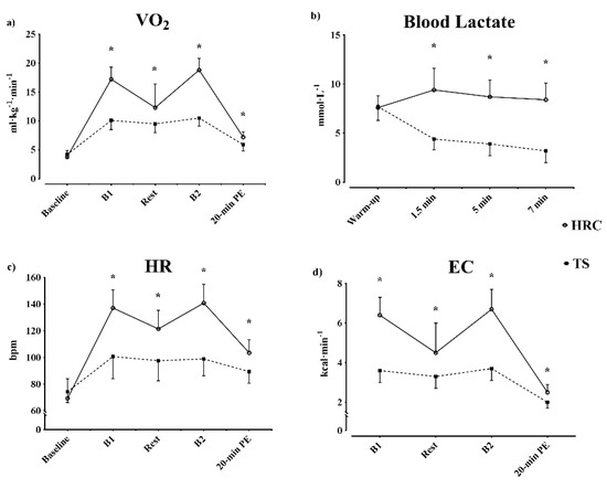 O2/BM and O2 at VT2 (O2,VT2) were significantly higher (p < 0.001) in HRC. Both respiratory variables responded similarly, corresponding to an aerobic demand ~75% greater during HRC than TS. The average HR was also significantly elevated (p = 0.001) in HRC, with a value ~39% greater than in TS. Additionally, the respiratory exchange ratio in HRC was ~6.7% higher than in TS (p < 0.001). Finally, HRC presented a ~66% greater EC when compared to TS (p = 0.001), as seen in Figure 2d.