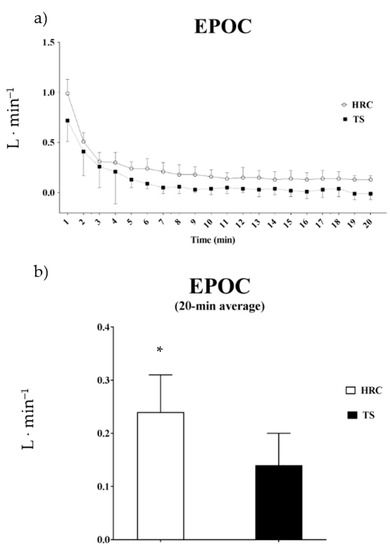 Excess post-exercise oxygen consumption after training session. EPOC = excess post-exercise oxygen consumption after training session. (a); excess post-exercise oxygen consumption per minute; (b); average of 20-min of excess post-exercise oxygen consumption; HRC = high-intensity resistance circuit-based training; TS = traditional strength training; * = significant differences, p ≤ 0.001.