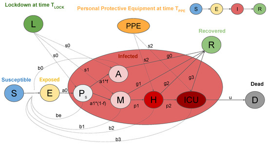 Graphic representation of the SEIRL model. Clinical stages of infection are: Susceptible (S), Exposed (E), Presymptomatic ( ), Asymptomatic (A), Recovered (R), Mild infection (M), Severe infection (H), Critical infection (), and Dead (D). Control measures: Lock-down measures (L) and personal protective equipment ().