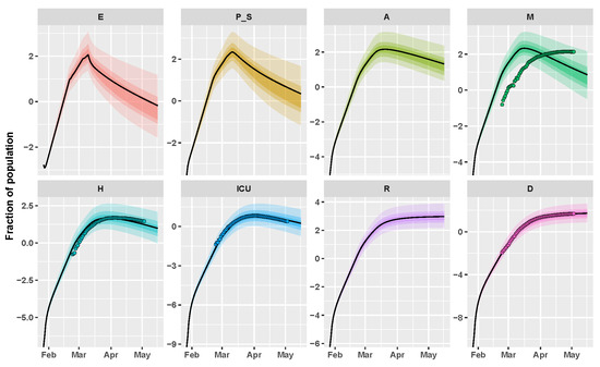 Umbria example. Time behavior of state variables when the parameter vector is equal to the final mode vector that is computed by CRC (black line); dots represent the data available at [21]. Data and simulations are in log-scale, normalized over the whole population of the region (∼882,000) and multiplied by . The colored area reproduces the variation of the temporal behavior when parameters vary between the 60th, 70th, and 90th percentile of their corresponding conditional pdfs (see Supplementary Materials). Time starts from 21 February 2020.