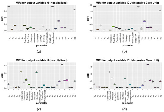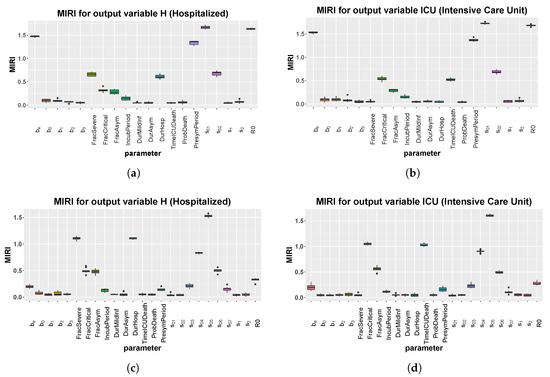 Umbria: boxplot of the 10 realizations of the MIRIs in output from the CRA for all model parameters. (a) Evaluation function: area under the curve of H. Stop time: 110. (b) Evaluation function: area under the curve of ICU. Stop time: 110. (c) Evaluation function: area under the curve of H. Stop time: 250. (d) Evaluation function: area under the curve of ICU. Stop time: 250.