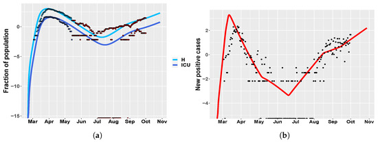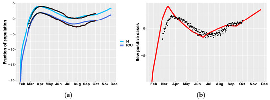 Umbria. (a) time behavior of hospitalized (light blue) and ICU (blue) patient in comparison with data of the Italian Civil Protection Department [21]. Data in red represent the second portion of the available dataset, from 4 May until 1 October 2020, which were not employed in model calibration. The newly introduced intervention parameters are set to: , , , , . (b) Umbria: time evolution of new positive cases in comparison with the data in [21].