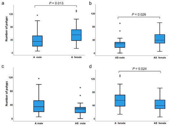 Difference between genders. (a) Comparison of polyp numbers in ApcMin/+ (A) males and females; (b) ApcMin/+;Sf1+/− (AS) males and females; (c) ApcMin/+ and ApcMin/+;Sf1+/− males; (d) ApcMin/+ and ApcMin/+;Sf1+/− females. Quartile values are represented as described in the legend of Figure 2. Actual values are listed in Table 4.