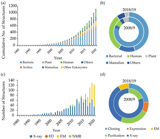 Fifteen years ago, the most commonly used expression system was E. coli followed by yeast; however, the move towards eukaryotic MP structural biology has seen a shift firstly towards insect cell expression systems and more recently mammalian cell expression systems. The shift towards eukaryotic targets and expression systems correlates well with an increase in the number of eukaryotic structures (Figure 1). Traditionally, milligram quantities of an MP have been required for crystallography. The requirement of high protein yields led to the use of recombinant overexpression, rather than natural sources, as the method of choice when producing MPs. The most popular and well characterised bacterial expression system for MPs is E. coli, but Lactococcus lactis is also a suitable expression system [48]. Advantages of bacterial expression include existing effective tools for genetic manipulation, the low cost of production, rapid growth rates and high cell densities. However, many MPs have proved to be toxic to the host or are incorrectly folded when overexpressed. The accumulation of mis-folded protein is potentially due to high transcription levels from the T7 promotor leading to the saturation of the Sec translocon. Saturation of the Sec translocon and the overloading of the bacterial quality control system in turn lead to the accumulation of the expressed MP in inclusion bodies. [48,49]. Efforts to mitigate this have led to the development of several E. coli strains [49,50,51].