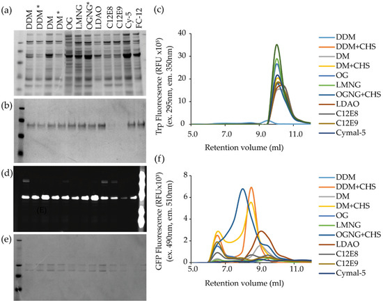 In the MPL, we use a combination of a simple extraction assay (including harsh control detergents such as SDS or Fos-Choline), coupled with small-scale purification before analysis by SDS-PAGE and FSEC. The GFP signal from the IMAC elution is used to ensure that only detergents that have effectively purified the MP of interest are screened by FSEC. This way we can screen multiple detergents or MPs in parallel in a 96-well plate format in 24 h (Figure 2a–f). Care should also be taken to ensure that the detergent does not inhibit the protease used for tag removal [103].