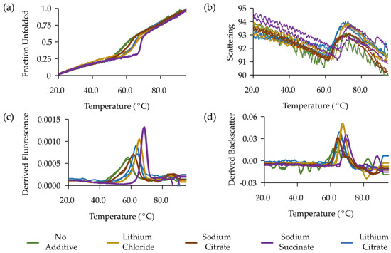 Assessment of MP function is not always straightforward and may require months of optimisation to generate interpretable results. However, production of functional protein is an essential prerequisite for any structural study. At the early stages of the MP production process, suitable pseudo functional alternatives can be explored that can act as a substitute for a full functional assay. One such possibility is to use differential scanning fluorimetry (DSF). This method is based on the measurement of protein unfolding using a fluorescent dye. Unfolding can be induced by heat or with denaturing chemicals. A comparison can be made between the midpoint of the unfolding event in the presence and absence of ligand [165,166]. The original DSF method used a dye that bound to hydrophobic regions of a protein that are exposed during unfolding. However, this approach is not suitable for MPs, and alternative methodologies were developed that rely on cysteine modification [167,168,169]. These methodologies are cheap and use minimal sample volumes but are unsuitable for proteins purified in reducing conditions. An alternative is to use a direct approach such as intrinsic tryptophan fluorescence to measure MP unfolding and backscatter to assess precipitation. NanoDSF instruments such as the Prometheus (Nanotemper) provide an ideal platform to measure this. Here, we present an example where a range of substrates stabilise a dependant dicarboxylate transporter vcINDY (Figure 3). The preferred substrate, succinate, stabilises vcINDY by 10 °C compared to 4 °C from the less readily transported citrate. Preference for succinate is also reflected in the onset of precipitation.