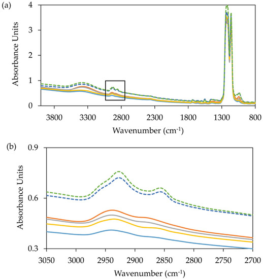 MIR spectrum of six different membrane protein purifications in octyl glucose neopentyl glycol (OGNG) with cholesteryl hemisuccinate (CHS) from ZMPSTE24 (solid lines) and a membrane receptor (dashed lines). (a) Full MIR spectra and (b) magnified MIR spectra (3050–2700 cm−1). Using a standard curve for a given detergent the amount of detergent in a sample can be quantified. In four of these cases (blue, yellow, grey and orange) detergent content is low (between 0.25% and 0.5%) and at the detection limit for the method. Low detergent readings are expected for these optimised purifications where detergent content is minimised throughout the purification. In the case of the membrane receptor, detergent concentrations are much higher ~2% (dark blue and green) as indicated by the peak at 2850 cm−1.