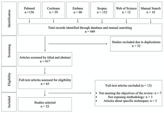 The initial search yielded 434 references and 10 were identified in the manual search (n = 449). After removing duplications, screening and applying inclusion criteria, 65 articles were included for data extraction and full-text assessment. However, 13 articles were excluded because they did not meet the objectives of the review, didn’t present a clear methodology, or were articles on specific techniques. Having read the full texts, 52 English language papers were selected as relevant to the objectives of the review. The PRISMA flowchart in Figure 1 summarizes the screening and selection processes. The selected articles were published between 1981 and 2020.