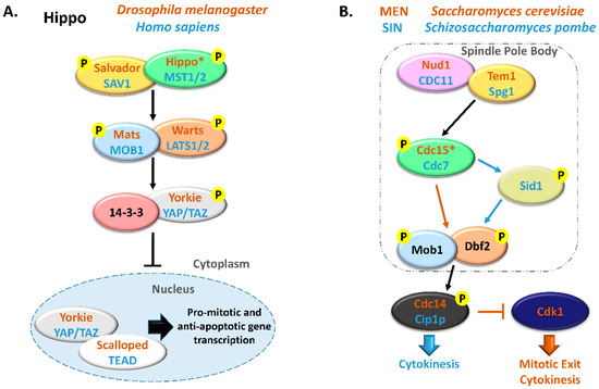 Comparison between Hippo and MEN/SIN pathways. (A) Schematic representation of the Hippo pathway in Drosophila melanogaster (orange) and in Homo sapiens (blue). (B) Schematic representation of the Mitotic Exit Network (MEN) in Saccharomyces cerevisiae (orange) and Septation Initiation Network (SIN) in Schizosaccharomyces pombe (blue). In these pathways, ortholog proteins are represented with oval nodes of the same color (yellow, Salvador/SAV1/Tem1/Spg1; green, Hippo/MST1/2/Cdc15/Cdc7; blue, Mats/MOB1/Mob1; orange, Warts/LATS1/2/Dbf2). * There are some controversies in the literature regarding whether to consider Cdc15 and Hippo as orthologous. This scheme is in accordance with Hergovich, 2017 [17].