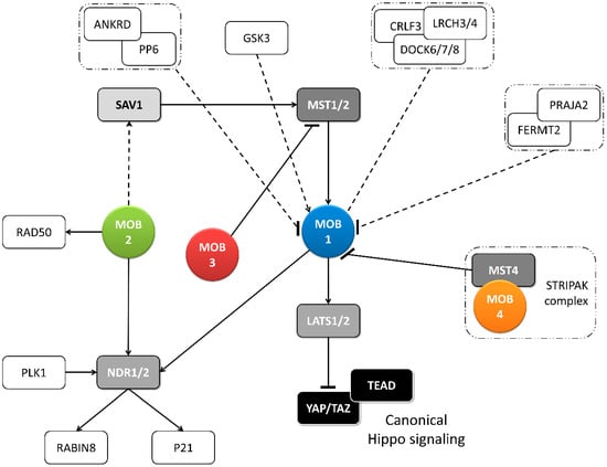 - Hergovich, A. MOB control: Reviewing a conserved family of kinase regulators. Cell. Signal. 2011, 23, 1433–1440. [Google Scholar] [CrossRef] [PubMed]