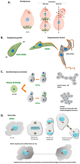 Interestingly, in the ciliate Tetrahymena vegetative cells, Mob1 accumulates in the basal bodies of the posterior pole creating a gradient through the antero-posterior axis of the cell. When cells divide Mob1 is recruited to the basal bodies that are localized at the cell midzone, just above the region where the cleavage furrow will be established. Thus, Mob1 localizes at the new posterior pole of the anterior daughter cell. The localization of Mob1 at basal bodies is mediated by Sas4 that promotes scaffolds for Mob1 localization to the cell cortex [141]. The Tetrahymena Sas4 is required, not only for basal body assembly and maintenance but integrates these events with the surrounding environment linking the perpetuation of cortical organization to cell division [141]. The depletion of Mob1 in Tetrahymena causes the abnormal establishment of the cell division plane and cytokinesis arrest. In these cells, as far as the division continues, Mob1 progressively accumulates with CdaI protein at the region where the furrow will be established and the future posterior pole of the anterior daughter cell develops [7,142]. Notably, the CdaI protein is absent in non-dividing cells and starts to localize at the ciliary rows of the anterior half of the cell when division initiates. Also, Tetrahymena CdaI mutants [143] phenocopies the depletion of Mob1 [142]. Moreover, the posterior boundary of the CdaI stained region is affected by the ELO1 protein [32] suggesting that the size of this region is regulated by these two proteins [32,142]. In fact, loss-of-function of Elo1 gene moves the division plane to the posterior pole [32], whereas the depletion of CdaI displaces it to the anterior pole of the cell [32]. Resembling the Mob1 localization, the ELO1 protein localizes at the posterior basal bodies in non-dividing cells and is recruited to the midline when division starts [7,32]. The Tetrahymena CdaI and ELO1 proteins are orthologues of the human MST1/2 kinases and the NDR/Lats kinases, respectively, showing that Tetrahymena possesses the core kinase module of the human Hippo signaling, which is coincident with the recent data obtained by Chen et al., 2020 [98]. The fact that the Tetrahymena genome seems to contain a gene for a Mob4 homolog, and the existence of the interplay between CdaI and ELO1, led Jiang et al. (2019) [32] to propose the existence in Tetrahymena of different Hippo signaling routes using different kinases belonging to MST1/2 and NDR/LATS kinase families, or even different Mob molecules. The studies in Tetrahymena clearly showed that Mob1 is a critical factor in cell polarity establishment apart from its role in cytokinesis. On the other hand, experiments carried out in the Stentor coeruleus, a ciliate that can regenerate an entire cell-organism from a fragment of one cell clearly showed that Mob1 is a critical factor for morphogenesis. In Stentor Mob1 was surgically removed from the anterior and posterior pole of the ciliate’s cells in a Mob1 knockdown background. These cells, contrary to controls, were unable to regenerate a normal morphology showing that Mob1 plays a role in the establishment of both anterior and posterior polarity in Stentor [144]. Altogether, the studies in ciliates showed that Mob1 is essential for the perpetuation of the complex patterning and axiation of the ciliate’s cell and morphogenesis, that are linked to accurate cell division ultimately required to maintain cell ploidy and genomic stability [7,144].