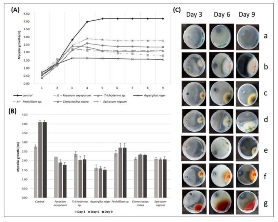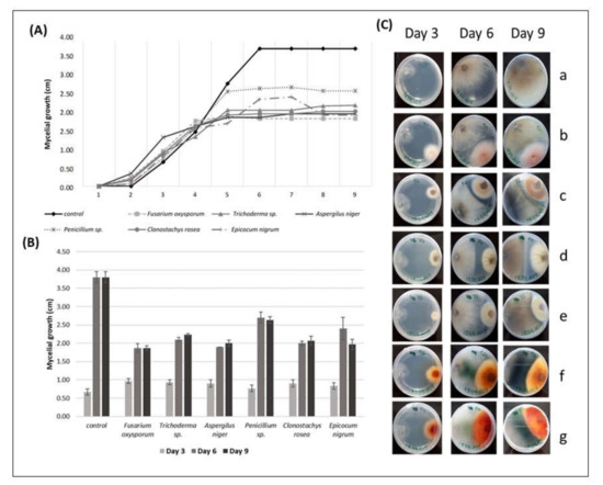 (A) The radial mycelial growth (cm) of Phialophora fastigiata over time (days), registered in direct inhibition tests with some endophytic fungi; (B) radial growth values of P. fastigiata (cm) (r P. fastigiata ± SE) in the presence of different endophytic fungi on the 3rd, 6th, and 9th day of direct antagonism test; (C) interactions of P. fastigiata, over the days, with grapevine endophytic fungi. P. fastigiata on the left side and the endophytic on the right side of the Petri dish. (a) P. fastigiata (control), (b) P. fastigiata vs. Fusarium oxysporum, (c) P. fastigiata vs. Trichoderma sp., (d) P. fastigiata vs. Aspergillus niger, (e) P. fastigiata vs. Penicillium sp., (f) P. fastigiata vs. Clonostachys rosea, (g) P. fastigiata vs. Epicocum nigrum. Pictures from the reverse side of the colonies.