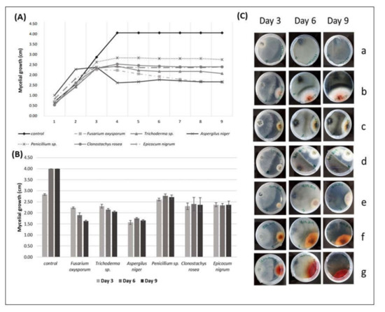 The growth of Diaporthe sp. started on the 3rd day (0.67 cm) and stopped on the 6th (3.80 cm). P. fastigiata started its growth on the 1st day (0.70 cm) and stopped it on the 5th day (4.10 cm), when the margins of the fungus reached the edge of the Petri dish. D. pseudoseriata started its growth on the 1st day (0.70 cm) and continued growing until the 4th day (4.00 cm). F. oxysporum started its growth on the 1st day (0.23 cm) and on the 9th day was still growing (2.80 cm). The growth of A. niger started on the 1st day and on the 9th reached 1.13 cm. Penicillium sp. had not started growing until the 3rd day (0.27 cm) and on the 9th reached 1.17 cm. Trichoderma sp. had growth from 1st (0.10 cm) to 9th day (1.78 cm). C. rosea started growing on the 2nd day (0.30 cm) and on the 9th day was still growing (2.30 cm). E. nigrum grew 0.43 cm on the first day and reached 4.03 cm on the 9th (Table 3).