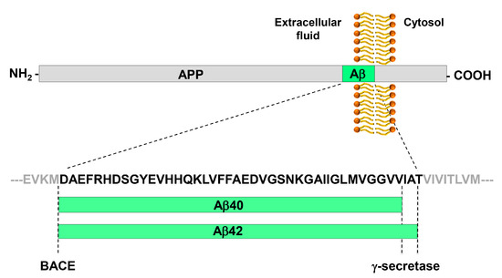 β-amyloid (Aβ) is a peptide, 38 to 43 amino acids long, that derives from the proteolytic processing of amyloid precursor protein (APP) by the γ-secretase; Aβ40 and Aβ42 are the most studied Aβ peptide species (