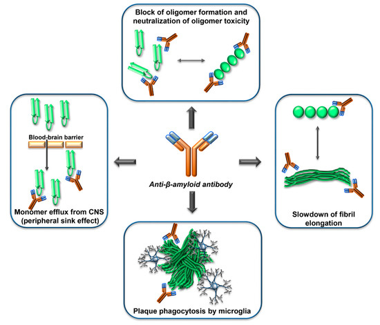 Different mechanisms of action of anti-β amyloid antibodies have been hypothesized or documented, including allosteric effects, the induction of plaque phagocytosis by microglia, the promotion of efflux of Aβ from the CNS to the circulation, the neutralization of β-amyloid toxicity (