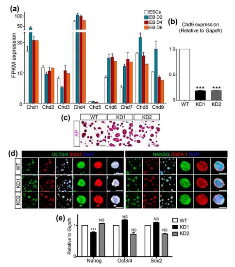 To examine the expression pattern of Chd genes during mouse ESC differentiation, a publicly available RNA-Seq dataset (GSE114219) was obtained and re-analyzed to compare the fragments per kilobase of transcripts per million mapped reads (FPKM) values of Chd1~9 (Figure 1a). Chd4 expression was the most abundant, whereas Chd5 expression was the least abundant during ESC differentiation. Among the subfamily III Chd genes, Chd6 and 7 were induced immediately after differentiation and their expression levels were maintained at least up to D6 of differentiation. In contrast, a mild increment in Chd8 and a robust increment in Chd9 were detected at D2, though their levels decreased sharply at D4 and D6. Next, we sought to determine the role of CHD9 in the maintenance of ESC pluripotency using the short hairpin (sh) RNA KD approach. To this end, two shChd9 were designed, tested for their KD efficiency, and found to repress ~80% of endogenous Chd9 expression (Figure 1b). Immunofluorescence, as well as AP staining, was performed to examine the levels of ESC markers, including OCT4, SOX2, NANOG, and SSEA-1. No gross changes in the levels of these markers were detected upon Chd9 KD in the ESCs (Figure 1c,d). Moreover, the transcript levels of the pluripotent genes in the Chd9 KD ESCs were indistinguishable from those in the control ESCs (Figure 1e). These data implied that CHD9 is dispensable for the expression of pluripotent markers.