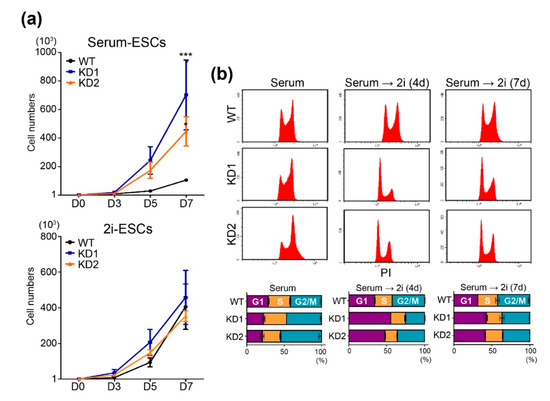 Chd9 depletion changes cell cycle distributions in the serum-ESCs. (a) Cell numbers of the Wild type (WT) and KD ESCs were measured at 3, 5, and 7 d after seeding 1000 ESCs in either normal serum (serum-ESC) or 2i-LIF (2i-ESC) (n = 3). (b) Histogram graph and percentages of G1, S, and G2/M phases in the WT and KD ESCs analyzed by flow cytometry (n = 3).