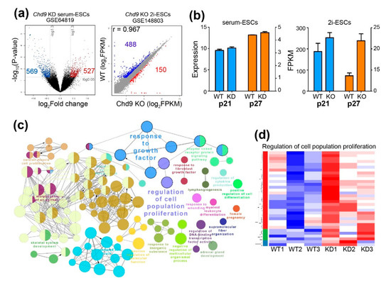 Chd9 depletion alters the expression of genes involved in the cell cycle in the serum-ESCs. (a) Volcano and scatter plot of microarray (GSE64819) and RNA-Seq (GSE148803) analyses. Upregulated genes and downregulated genes are indicated as red and blue dots, respectively. (b) qPCR analysis of p21 (encoded by Cdkn1a) and p27 (encoded by Cdkn1b) in the serum-ESCs and 2i-ESCs. (c) Gene ontology (GO) term analysis (biological processes (BP)) in the Chd9 KD serum-ESCs. DEGs that were upregulated upon Chd9 KD were used in the analysis. (d) Representative heatmap of the genes significantly altered by Chd9 KD among the genes related to the “regulation of cell population proliferation” category.