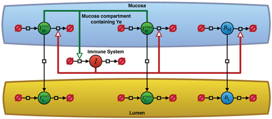 Our model for Ye, as described in Geißert et al. [10], considers three different sites with their individual population dynamics. Figure 1 depicts an overview of the model in the form of a Systems Biology Graphical Notation (SBGN) [24] PD diagram [25] based on an illustration by Geißert et al. [10]. The lumen and the mucosal site of the small intestine are illustrated as two separate compartments by abbreviated notations L and M in Table 1. The mucosa and lumen sites include three different population dynamics: commensal bacteria, wt Yersinia, and mut Yersinia.