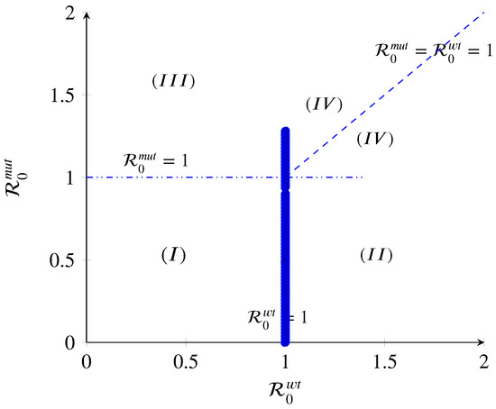 For and , thus, is a simple zero eigenvalue, and the other eigenvalues are real and negative. This implies that transcritical bifurcation occurs in the disease-free equilibrium for and , and the uninfected state is stable (not asymptotically stable) as none of the strains persist. As soon as the two equilibria collide non-destructively, exchanging their stability and resulting in the Jacobian matrix having a single eigenvalue that is equal to zero, then either the mut strain or the wt appears and persists for or , respectively.