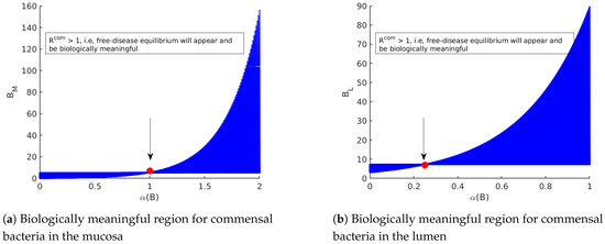 Due to biologically meaningful disease-free state and holding the conditions and , the disease-free state would be meaningful if . Therefore, the commensal bacteria appear, slightly reaches above one, and a stable disease-free state happens. Due to the presence of commensal bacteria and instability of the trivial solution, the solution corresponds to the extinction of all populations that never appear because if , all components of the disease-free equilibrium will lie out of the biologically meaningful region.