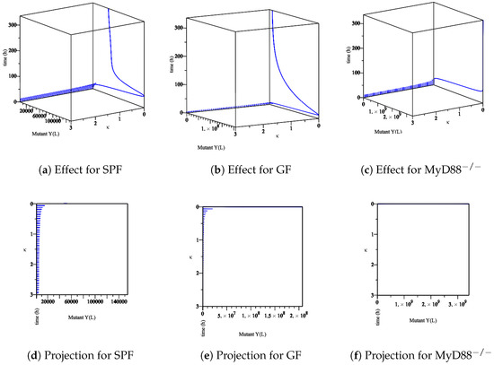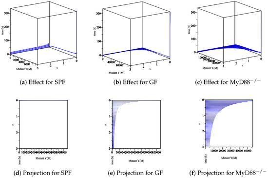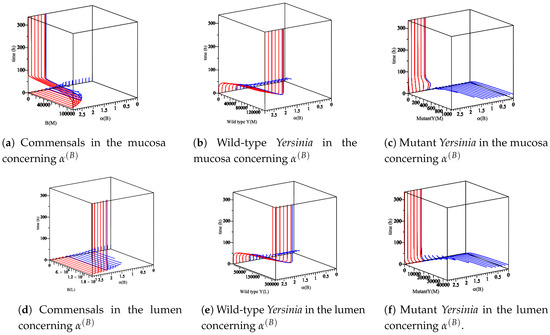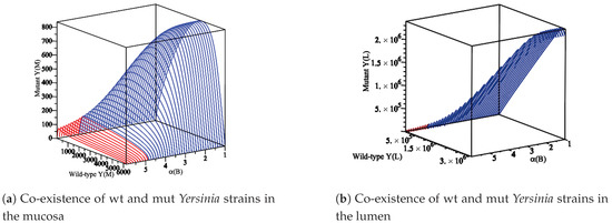 Furthermore, we looked for conditions in the immune system to see different scenarios of a weaker and more robust immune system in fighting against infection. This resulted in the analysis of systems with respect to parameter . We found that if mice possess a healthy microbiota and immune system, as long as the growth rate of commensal bacteria is larger than the growth rate of wt and mut Yersinia, then the infection will not spread, as Ye strains cannot enter the lumen compartment.