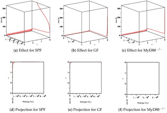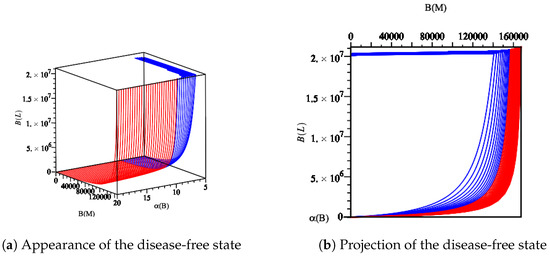 Diagram displaying the disease-free state by fixing the parameter values Ye SPF wt/A0 from Table 3 in Model (14). As long as is large enough, the disease-free state persists. However, by reducing , the basic reproduction number reaches its threshold value (). This causes changes in the dynamic behavior of the model (14), as shown in Figure 4.