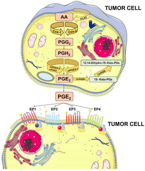 The involvement of inflammation in cancer progression was first described in 1863 by Rudolf Virchow. He observed that infiltrated immune cells reflect the place where cancer lesions appear in the inflamed tissue and hypothesized that chronic inflammation is a condition that predisposes one to cancer development. Most recent observations revealed that there is a direct causal link between inflammation and cancer: it is estimated that primary infections (such as Helicobacter pylori, hepatitis B and C viruses) and inflammatory responses are linked to 7% to 30% of cancer deaths worldwide [1,2]. Consistently, epidemiological observation showed that daily aspirin or other non-steroidal anti-inflammatory drugs (NSAIDs) reduced deaths due to several common cancers [3,4,5,6,7], indicating that cyclooxygenase (COX) inhibition and the reduction of its main metabolic product, prostaglandin E2 (PGE2), may prevent solid-organ cancers.