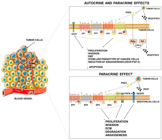 As occurs in extrinsic inflammation, an increasingly large body of evidence indicates that PGE2 promotes tumor growth through autocrine and paracrine mechanisms by activating EP receptors present both in cancer cells and in stromal cells and by transactivating growth factor receptor tyrosine kinases (RTKs) frequently upregulated in cancer cells [15,98]. EP receptors activate a range of intracellular signaling pathways that mediate the effects of PGE2 on cell functions.